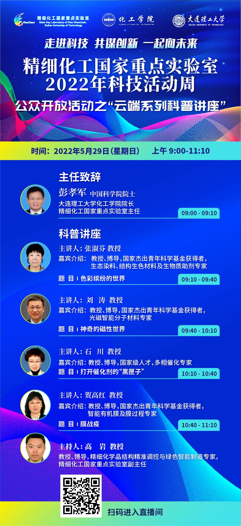 为响应国科基函〔2022〕29号《科技部基础研究司关于国家重点实验室在2022年全国科技活动周期间开展公众开放活动的通知》文件号召,宣传科技创新成果、开展科技为民服务活动,精细化工国家重点实验室将于5月29日举行2022年实验室科技活动周公众开放活动,主题是“走进科技,共谋创新,一起向未来”。