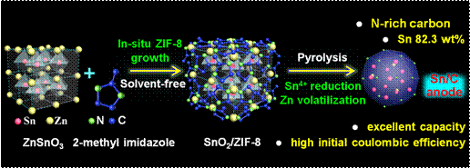 不同于常规的通过物理方法或溶液自组装制备炭包覆纳米锡颗粒的方法,精细化工国家重点实验室陆安慧教授课题组最近创新性地提出了采用无溶剂法以纳米二元金属氧化物(ZnSnO3)为前驱体原位生长金属有机骨架ZIF-8制备Sn@C复合材料的新策略。根据软硬酸碱理论,2-甲基咪唑作为交界碱优先与交界酸Zn2+结合生成ZIF-8,后续的热解过程使ZIF-8转变为含氮的导电炭网络,ZnSnO3炭热还原为纳米锡颗粒和单质锌,单质锌由于熔点较低在高温下动态挥发创造出丰富的孔隙,有利于离子和电子的传输。这种新的合成方法保证了复合材料中锡纳米颗粒的高度分散,发达的孔隙结构和高氮含量(5.3 wt%),从而可以有效缓解在嵌锂过程中的体积膨胀和提高电导率。电池性能测试结果显示制备的Sn@C复合材料在200 mA g-1的电流密度下,首次放电容量为1321 mA h g-1,首次库伦效率高达80.1%。循环150次后容量保持为901 mA h g-1(电流密度为200 mA g-1)690 mA h g-1(电流密度为1 A g-1)。此外,这种合成方法可以扩展到制备其他材料如MnO@C复合材料,同样展现优异的电化学性能。相关研究成果最近以“Designed Synthesis of Nitrogen-richCarbon Wrapped Sn NanoparticlesHybrid Anode via in-situ Growthof Crystalline ZIF-8 on a Binary Metal Oxide”为题发表在Nano Energy 2016, 19, 486–494(第一作者博士生程菲)。该研究工作得到了国家杰出青年基金和国家自然科学基金的资助支持。