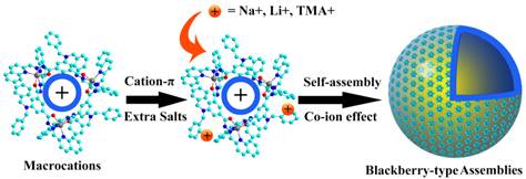 同离子效应普遍存在于化学及生物体系中。尽管普遍认为同离子对于大分子离子的溶液自组装行为影响很小,但是最近的研究发现,手性的同离子会选择性的抑制大分子离子对映异构体的自组装过程。因此,这一领域仍然存在着很大的空白。金属有机大环因其纳米尺寸及带电荷的性质,是典型的大分子离子模型。前期的研究发现,这类纳米尺寸的阳离子结构在溶液中会自组装成高度有序的、空心、球形、单层的“blackberry”结构。通过调控外加的反离子或溶剂组成,会对大分子离子的自组装过程产生强烈的影响,然而自组装过程中的同离子效应则常常被忽略或者被认为影响很小。因此,发现强烈的同离子效应对于研究大分子离子自组装具有积极的意义。