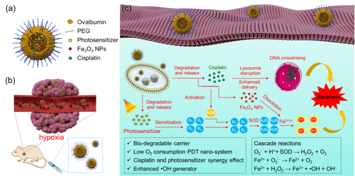 可生物降解的卵清纳米胶囊包含I型光动力光敏剂(NBS),顺铂药物和用于芬顿(Fenton)反应的Fe3O4纳米颗粒。通过条件优化,上述三种功能试剂均可包裹于卵清纳米粒子内部,并展现出很高的共包封效率。即使在严格的低氧环境下(2% O2),光敏剂NBS仍具有优异的I型PDT功效。即在光照下,PDT产生超氧阴离子,并在超氧化物歧化酶(SOD)的催化下转化为H2O2,然后经Fe3O4纳米颗粒介导的芬顿反应过程中转化为剧毒的•OH同时释放O2。因而,该过程可实现氧气的循环利用,克服缺氧对PDT效率的影响。另外,PDT过程促进了药物(顺铂,临床抗癌药)的溶酶体逃逸,使抗癌药物高效向核内递送。同时,在烟酰胺腺嘌呤二核苷酸磷酸氧化酶(NOX)的存在下,顺铂也会产生超氧阴离子,可起到补充•OH的作用进一步以提高治疗效率。由于PDT与化疗的协同作用,该卵清蛋白纳米颗粒在缺氧耐药肿瘤的治疗中展现出优异的效果。这一策略有望用于增强抗癌治疗。