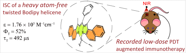 氟硼吡咯 (BODIPY) 荧光团是一个“明星”分子,由于具有良好的光物理和光化学性质,如对可见光吸收能力强、荧光量子产率高、结构易修饰等优点,得到了广泛的应用。基于BODIPY发色团的三重态光敏剂已有报道,但吸收波长较短、分子结构多样性、ISC机理也有待于进一步拓宽。最近,赵建章教授课题组和美国马萨诸塞大学医学院韩纲教授、意大利帕多瓦大学Antonio Barbon教授、德国雷根斯堡大学Bernhard Dick教授、阿卜杜拉国王科技大学Omar F. Mohammed教授等合作研究了一个具有扭曲分子结构的无重原子BODIPY分子的高效ISC能力 (三重态量子产率, FT = 52 %) 和超长三重态寿命 (tT = 492 ms),通过稳态和纳秒、亚纳秒瞬态吸收光谱详细研究了该无重原子BODIPY分子体系的光物理过程;并通过时间分辨顺磁共振波谱(TREPR)以及理论计算研究了ISC机理以及三重激发态子能级的选择性布居、以及三重态波函数的空间分布范围,从而解释了这种无重原子分子的ISC机制,其ISC主要是由具有扭曲结构的BODIPY分子的对称性降低所导致的,从而增强了自旋轨道耦合 (SOC)和ISC效率。该类光敏分子合成简单、成本低廉,由于其优异的光物理性质,可以在极低剂量的试剂浓度 (0.25 mg/kg,远低于最低临床使用剂量0.1 mg/kg,如ALA和 Photofrin) 及低光剂量 (6 J/cm2) 下即实现了高效的光动力治疗效果,将该化合物制备成纳米粒子与免疫药物联用,具有增强免疫治疗效果、协同治疗转移肿瘤的功能,并用肿瘤动物模型验证了其突出的治疗转移肿瘤的效果。因此,该类分子有望成为临床上新一代光动力治疗试剂及转移肿瘤治疗试剂。这一成果近期发表在Angew. Chem. Int. Ed. 期刊上 (Elucidation of the Intersystem Crossing Mechanism in a Helical BODIPY for Low-Dose Photodynamic Therapy. Angew. Chem. Int. Ed., 2020, 59, 16114– 16121),论文的共同第一作者是大连理工大学博士生王智佳、马萨诸塞大学医学院博士后黄灵和大连理工大学硕士生闫雨欣。
