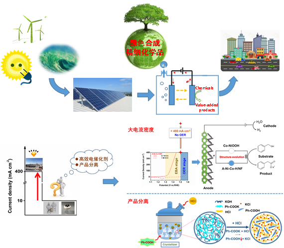 传统的精细化学品合成方法,耗能高,通常需要高温高压及添加助剂(部分添加剂有毒、有害)提升转化效率,不利于节能和环保。与传统的热催化技术相比,精细化学品的电催化合成技术具有反应条件温和反应速度快等优势,能够实现精细化学品的高效绿色清洁制备更重要的,电催化合成工艺能够与太阳能风能潮汐能等可再生能源有机融合利用大量的低品位新电能,降低精细化学品的生产成本,减轻或避免环境污染问题。目前,精细化学品的电催化高效合成,面临三个瓶颈性的约束问题需要解决新结构高性能电催化剂的设计合成如何避免竞争性副反应,在工业级的大电流密度下实现精细化学品的规模化/工业化生产;如何将电催化制备的反应产物从成分复杂的电解质溶液中高效分离和提纯成合乎要求的产品。