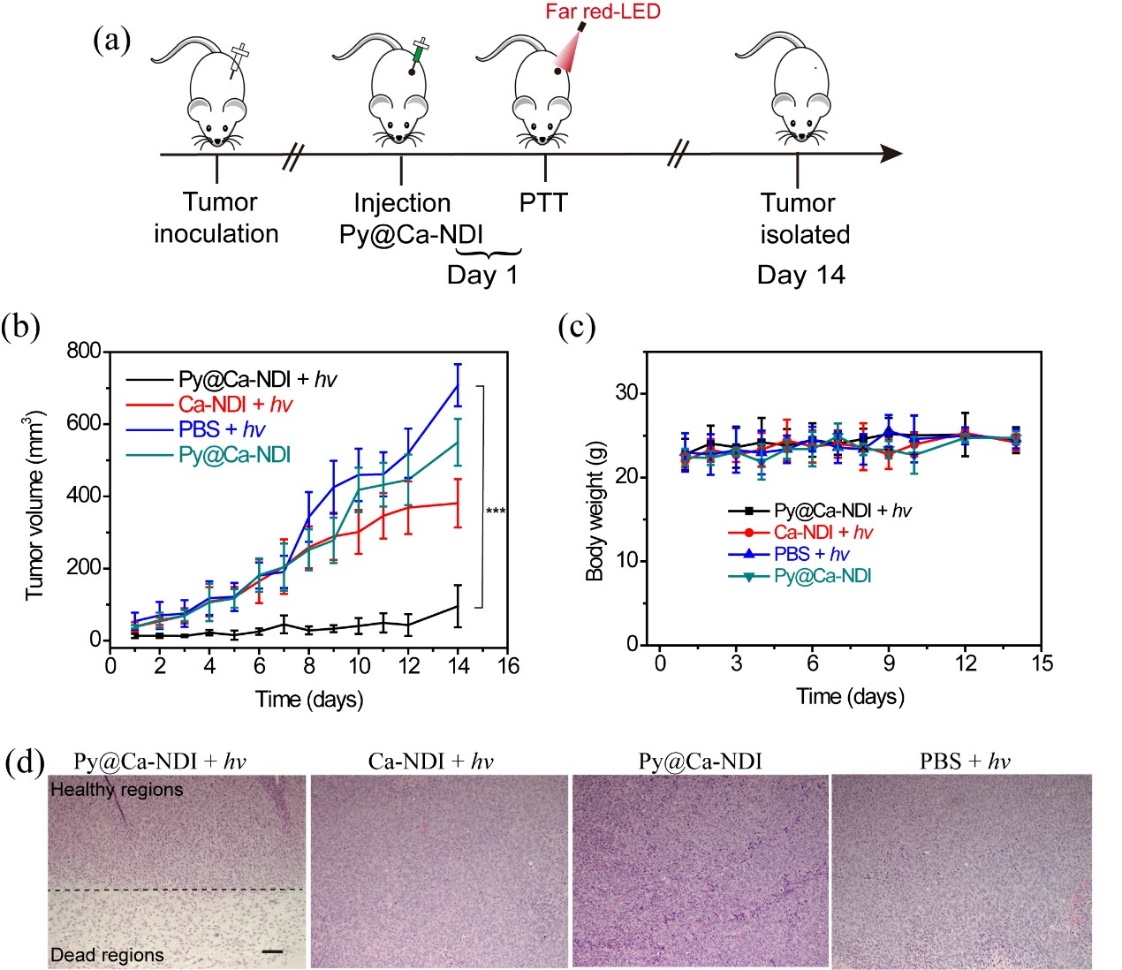 近日,大连理工大学的段春迎教授与美国麻省大学医学院的韩纲教授合作利用主客体化学策略,构筑了一例基于金属有机骨架(MOFs)的有机共晶。以萘酰亚胺(NDI)为配体构筑缺电子型MOF材料,通过π-π弱相互作用其孔道可以包合富电子客体芘得到主客体共晶MOF。同时,二重穿插的MOF结构进一步增加了缺电子萘酰亚胺基团的分布,增强并且稳定了萘酰亚胺和客体分子芘之间的电荷转移作用(分子间距离3.47 Å),使得主客体共晶MOF材料可以在水溶液中稳定存在,并获得了高达41.8%的光热转换效率,是目前报道的有机共晶材料的最高值,远远高于FDA批准的光热试剂ICG。在近红外光照射下,该主客体共晶MOF材料成功实现了体外和体内对肿瘤细胞的高效清除,突破了共晶材料在水相以及生物体系中的应用限制。