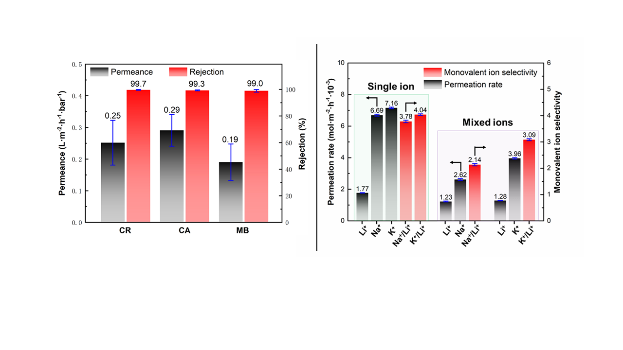对多晶PB膜的染料截留测试表明,PB膜对100 mg/L的刚果红(CR)、钙黄绿素(CA)和亚甲基蓝(MB)均保持出色的截留效率(>99.0%)。离子筛分测试结果进一步表明,多晶PB膜对不同托克斯直径的单价金属离子Li+(0.48 nm),Na+(0.37nm) 和 K+(0.25 nm)的具有优异的分离选择性:其对Na+/Li+和K+/Li+的理想选择性分别达到3.78和4.04;在二元混合体系中对Na+/Li+和K+/Li+的选择性分别达到2.14和3.09;在三元混合体系中对Na+/Li+和K+/Li+的选择性分别达到3.12和6.31。综合而言,其单价金属离子筛分性能位居同骨架维度分子筛膜中前列。