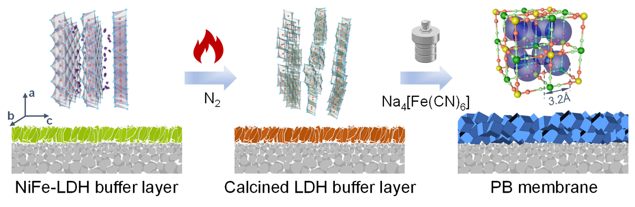 普鲁士蓝(Pussian Blue, PB) 是一种混合价态铁离子与氯化物阴离子结合而成的配位化合物,于1706年首次作为着色牢固的蓝色染料而被发现。目前,PB及其类似物作为电极材料、超级电容器、传感器和气体吸附剂由于其重要潜在应用价值,已受到广泛关注。PB由于具有3.2 Å的规则孔径,有望实现精准单价金属离子筛分;但由于体相成核速率过快,相邻PB晶粒间难以实现良好连生,因此制备致密多晶型PB膜仍极具挑战性。