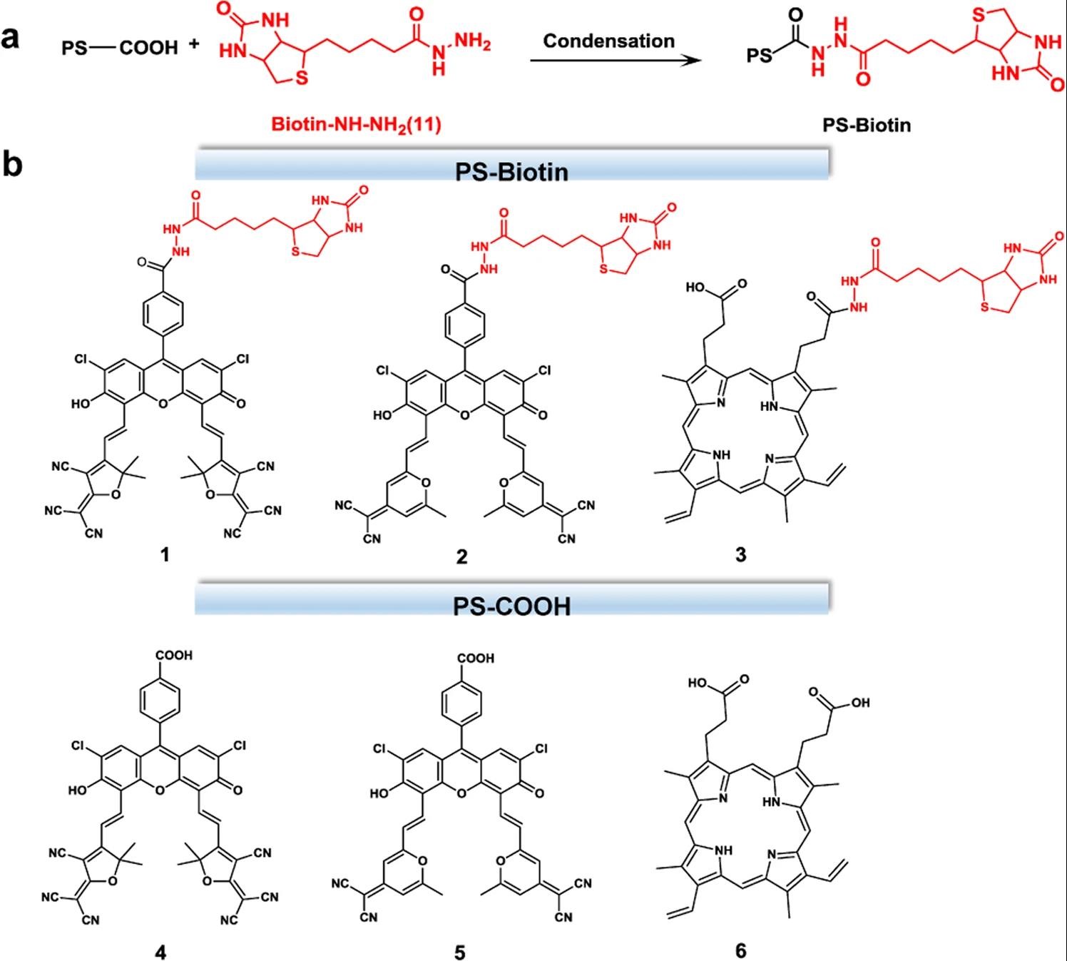 图1 (a)光敏剂生物素化策略。(b)化合物1-6的化学结构。