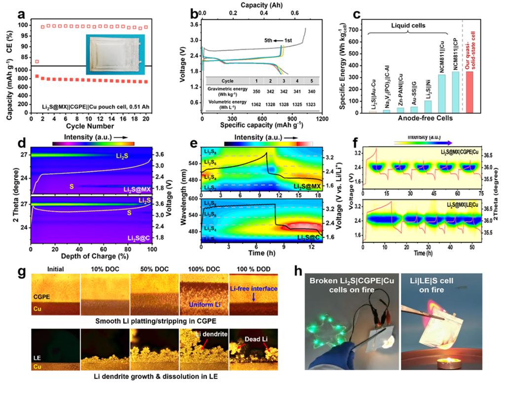 图2. 基于硫化锂正极的准固态无负极电池的电化学性能、反应机制与安全性:(a, b)Ah级准固态软包电池的比容量及比能量;(c)与现有液态电池体系能量密度的比较;(d)原位X射线衍射分析揭示硫化锂正极在工况条件下的结构演变;(e)原位紫外可见光谱阐释凝胶电解质在工况条件下的化学环境演化;(f,g)原位X射线衍射与原位金相显微镜揭示负极侧集流体上的锂沉积与剥离行为;(h)耐火阻燃性能。