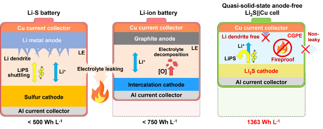 图1. 准固态无负极电池的结构及其相较于传统锂离子电池、锂硫电池的优势