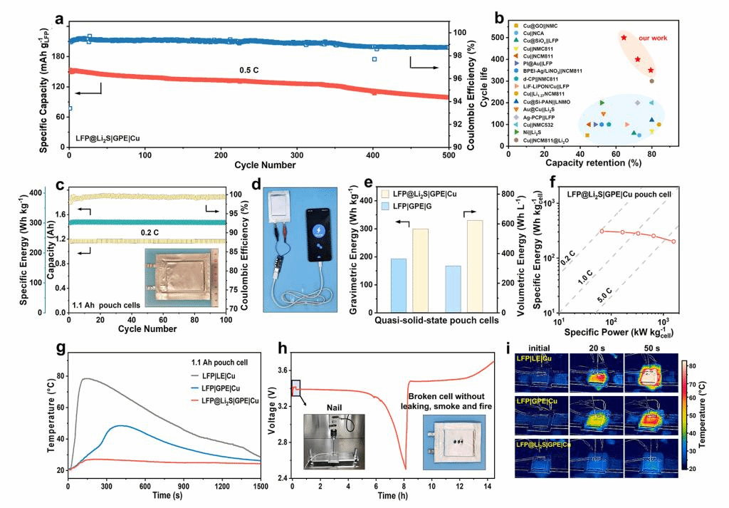 图2. 准固态无负极电池的(a-f)电化学性能(g-i)与安全性