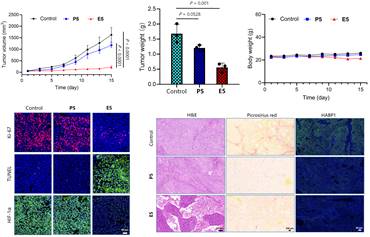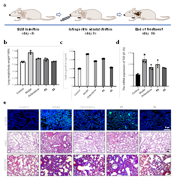 研究团队通过结构筛选、稳定性测试等一系列实验,筛选出能够于水溶液中稳定释放吡非尼酮类似物P5、单线态氧和三线态氧的内过氧小分子E5。该化合物释放药物的半衰期为8小时,且单线态氧和三线态氧的释放比例为1:1。该化合物分子量较小(217),且能够在低温下长期保存。细胞层面的抗肺癌研究表明,E5有效地抑制了肺癌细胞的增殖、迁移和侵袭,同时阻断了TGF-β1诱导的肌成纤维细胞分化。活体实验表明,E5能够有效抑制肿瘤生长,下调HIF-1a蛋白的表达,并且缓解博来霉素诱导的肺纤维化,且具有良好的生物相容性。