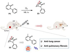 近日,大连理工大学精细化工国家重点实验室,制药工程系Akkaya院士和王磊副教授基于前期内过氧类单线态氧载体的疾病诊疗研究工作(Angew. Chem. Int. Ed. 2022, 61, e202210249; Angew. Chem. Int. Ed., 2016, 55, 2875; Angew. Chem. Int. Ed., 2016, 55, 3606; Chem. Commun., 2024, 60, 8111; Chem. Commun., 2022, 58, 1902; Chem. Eur. J. 2024, e202401277),开发出新型内过氧类多组分药物递送体系,用于治疗肺癌并肺纤维化,研究成果以“N-Phenyl-2-Pyridone-Derived Endoperoxide Suppressing both Lung Cancer and Idiopathic Pulmonary Fibrosis Progression by Three Pronged Action”为题发表于Angew. Chem. Int. Ed. 2024, e202408473。
