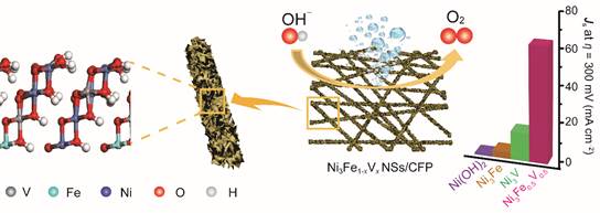 化石燃料储量有限,难以满足人类社会迅速增长的能源需求,氢气是一种高能量密度且不含碳的能量载体,可以作为化石燃料的替代品。利用从风能、太阳能等可再生能源转换得到的电能,通过电化学催化水裂解产氢,从而将电能转换为化学能,是一种间接利用可再生能源制氢的可行途径。电催化水裂解过程包含阴极析氢(HER) 和阳极析氧(OER) 两个半反应,其中OER涉及到四个电子和四个质子转移的复杂过程,需要较大的过电位,且反应速率缓慢。为了实现高效率、低成本、大规模制氢,需要解决的关键问题之一是研发高效、稳定、廉价的水氧化催化剂。精细化工国家重点实验室王梅教授指导的博士研究生蒋健,在前期对于NiB0.45/NiOx核壳异质结构纳米粒子膜电极高效电化学催化水氧化反应研究工作的基础上 (Nano Energy 2017, 38, 175−184),进一步研发了高效、稳定的Fe/V共掺杂的a-Ni(OH)2超薄纳米片阵列电极。该三元非贵金属催化剂表现出优异的电化学水氧化活性,电流密度达到100和500 mA cm-2时,过电位仅为264和291 mV,同时表现出很好的稳定性。利用X-射线吸收谱 (XAS)、扩展X-射线吸收精细结构 (EXAFS)、球差矫正亚纳米分辨的高角环形暗场像-扫描透射电镜(HAADF-STEM) 以及密度泛函理论计算(DFT) 等实验技术和理论方法从原子层面剖析了高效的Fe/V共掺杂的NiOOH水氧化催化剂,排除了掺杂离子在间隙位和表面吸附位的可能,证实了掺杂的Fe和V离子替代Ni(OH)2晶格中的Ni离子占据格点位置,并且发现在Ni3Fe0.5V0.5中的V具有高度扭曲的八面体配位结构和较短的V−O键长。X-射线光电子能谱(XPS) 和软X-射线吸收谱 (SXAS) 研究表明,不同d带中心的Fe、V和Ni3d金属离子之间存在协同的电子互相作用,从而影响主体材料中金属离子的局部配位环境。原位X-射线精细结构 (EXAFS+XANES) 揭示了在水氧化过程中M-M'和Ni-O/Fe-O/V-O键都有不同程度的收缩,意味着三种金属离子的局部配位环境和平均氧化态均发生变化;其中V-O键收缩最为明显,形成了严重扭曲的[VO6] 八面体结构。同时,DFT + U理论计算结果表明在Fe和V原子聚集处的V位点具有最优的氧中间态结合能和最低的理论过电位,从而明显提高了镍基催化剂的电化学催化OER的本征活性。这些实验和理论研究结果为从原子层面深入理解V掺杂的多元金属氧化物高活性催化电化学水氧化的原因及真正的催化活性位点提供了关键实验证据和理论依据。研究结果发表在Nature Communications, 2018, 9:2885(1−12).