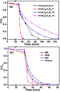 近年来,原子簇和单原子催化剂成为催化领域的研究热点,然而制备高活性位点密度的原子簇和单原子催化剂仍然具有很大的挑战性。郭新闻教授团队与中科院大连化学物理研究所以及美国普渡大学合作,通过密度泛函理论计算预测了原子簇和单原子位点铁可以稳定在g-C3N4载体上,进而通过简单的一步热解法合成了高金属负载量(18.2wt%)的FeNx/g-C3N4催化剂。该催化剂应用在光芬顿反应中可以高效地移除各种模型有机污染物(亚甲基蓝、罗丹明B、甲基橙和苯酚),并且表现出很高的稳定性,铁流失量仅为0.69 mg/L。研究团队利用球差矫正电镜、同步辐射X-射线吸收技术、57Fe穆斯堡尔谱、X-射线光电子能谱等多种手段细致研究了催化剂的组成、结构及其与催化活性之间的关系。研究团队认为g-C3N4载体中高含量的氮原子可以提供足够的锚定位点稳定铁原子簇和单原子位点,提出了Fe-Nx稳定结构的存在,并详细评价了Fe-Nx在催化降解反应中的活性。该工作在合成和表征Fe-N-C类催化剂方面的结果对于设计制备高密度活性位点的原子簇和单原子催化剂具有指导和借鉴意义。