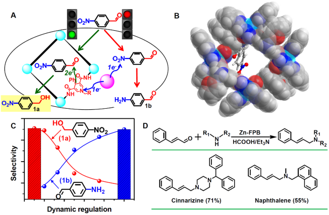 近年来,选择性氢化反应在手性与不饱和药物分子等功能精细化学品生产中广泛应用,是一个迅速发展的领域。利用贵金属作为催化剂的传统方法是通过直接活化特定基团提高选择性,应用的底物范围有限,无法在一个反应体系中实现不同功能产物的制备。另外,值得关注的是,反应需要高压氢气作为氢源、条件相对苛刻、危险性高且原子经济性差。因此,温和条件下的选择性催化氢化反应成为当代合成化学领域所关注的富有挑战性的研究课题之一。然而一般条件下氢化反应优先发生在热力学更有利的基团上或者多种不饱和基团同时被氢化,目标氢化产物的选择性制备是极其重要但同时又是非常困难的,尤其是在一个反应体系中实现选择性调控,制备不同功能的氢化产物更具有挑战性。基于此前研究工作,该团队开创性地将辅酶的活性中心引入金属-有机超分子限域结构,制备了一种氢化反应选择性可切换的超分子反应器,成功实现选择性可切换的氢化过程。