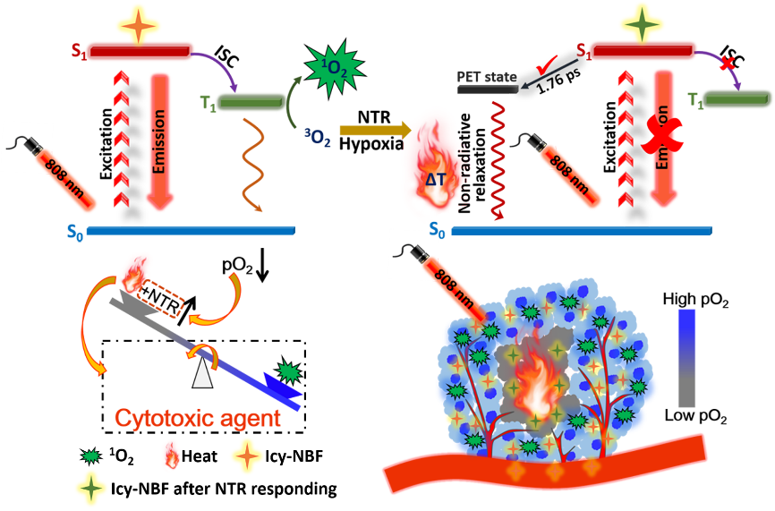 精细化工国家重点实验室樊江莉教授团队提出了一种新颖的策略,开发了一例基于氧气含量调节激发态失活过程的近红外光敏剂(Icy-NBF)。肿瘤氧气含量的降低会诱导细胞内硝基还原酶的表达增多,Icy-NBF会与硝基还原酶(NTR)发生特异性响应,含芳硝基的基团经还原后脱除,得到分子Icy-NH2(整个过程如图1所示)。在整个催化还原过程中,光敏剂的激发态失活过程也发生了变化。对于光敏剂(Icy-NBF),在808 nm光照射下,激发态失活过程为辐射跃迁和与氧气的能量转移。对于Icy-NH2,激发态失活过程主要归因于光诱导电子转移引起的非辐射弛豫。由此,光敏剂Icy-NBF可以在肿瘤有氧处进行氧气敏化产生的单线态氧进行光动力治疗,也可在乏氧处转化为Icy-NH2,对乏氧肿瘤进行不需要氧气的光热治疗。与FDA批准的临床光敏剂ICG相比,Icy-NBF从氧气敏化和光热转换两方面均提高了对光子的利用。在细胞光疗评估中对有氧和乏氧癌细胞均表现出优异的抗癌效果,并最终在肿瘤活体治疗中,将肿瘤完全抑制甚至消除。这项研究为未来开发高效光子利用的光疗用光敏剂提供了具有指导性的分子设计策略。