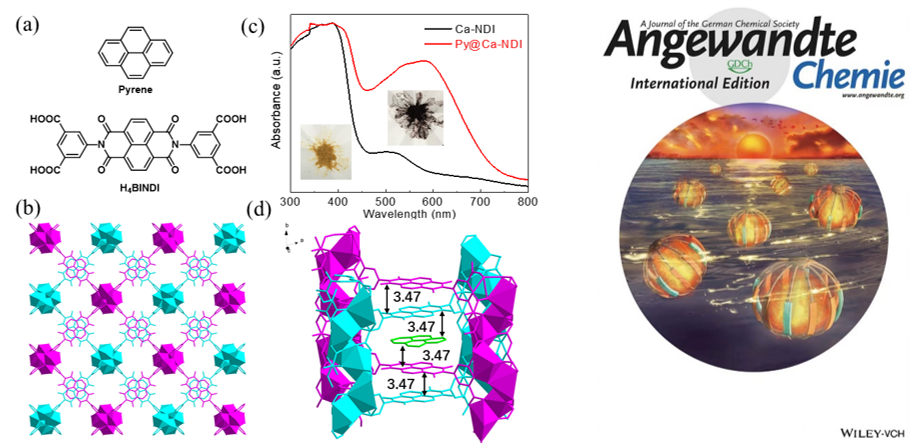 近日,大连理工大学的段春迎教授与美国麻省大学医学院的韩纲教授合作利用主客体化学策略,构筑了一例基于金属有机骨架(MOFs)的有机共晶。以萘酰亚胺(NDI)为配体构筑缺电子型MOF材料,通过π-π弱相互作用其孔道可以包合富电子客体芘得到主客体共晶MOF。同时,二重穿插的MOF结构进一步增加了缺电子萘酰亚胺基团的分布,增强并且稳定了萘酰亚胺和客体分子芘之间的电荷转移作用(分子间距离3.47 Å),使得主客体共晶MOF材料可以在水溶液中稳定存在,并获得了高达41.8%的光热转换效率,是目前报道的有机共晶材料的最高值,远远高于FDA批准的光热试剂ICG。在近红外光照射下,该主客体共晶MOF材料成功实现了体外和体内对肿瘤细胞的高效清除,突破了共晶材料在水相以及生物体系中的应用限制。