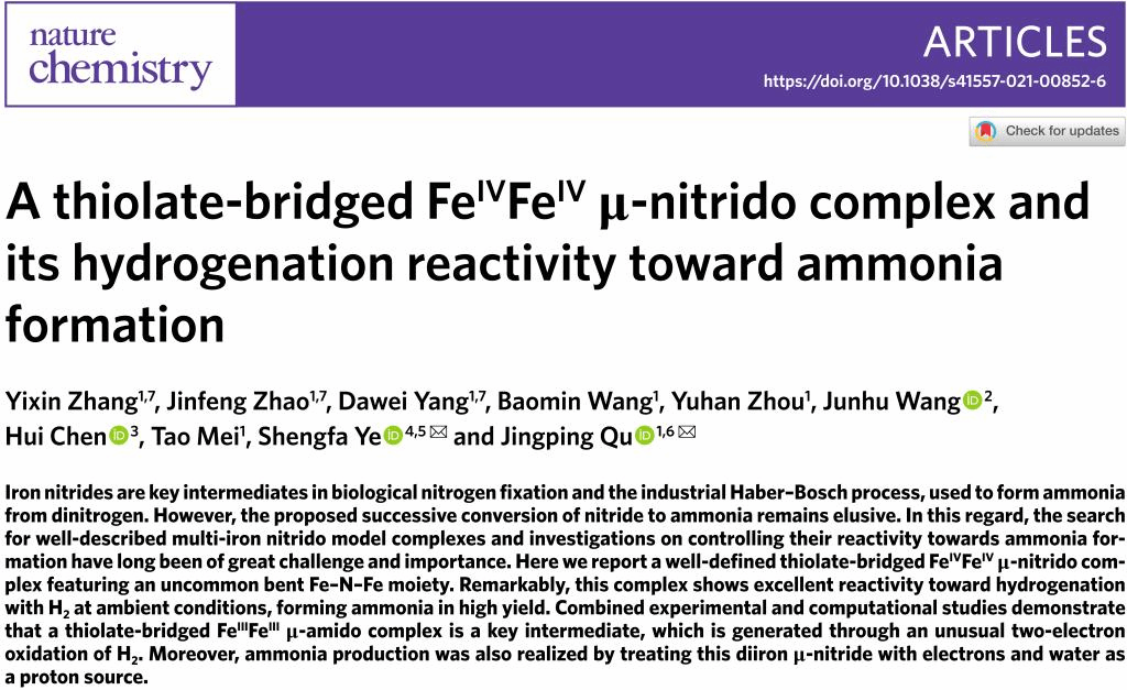 我校精细化工国家重点实验室曲景平教授研究团队与中国科学院大连化学物理研究所叶生发研究员等合作,在仿生化学模拟生物固氮酶研究领域又取得了新进展。相关研究成果以“硫桥联四价四价双铁氮桥配合物及其对氨生成的加氢反应性能”为题,近日发表在《自然•化学》(Nature Chemistry)上。同时,德国布伦瑞克工业大学Marc D. Walter教授,在《自然•化学》新闻与观点栏目中,以“重新审视氨的形成(Ammonia formation revisited)”为题,对该研究工作的意义和结果进行了积极评述。这是曲景平研究团队,继2013年在仿生化学固氮体系的构筑与功能化研究工作的基础上,取得的又一项重要进展,系统性研究成果连续发表在《自然•化学》期刊上(Nature Chemistry 2013, 5, 320;《2014中国科学发展报告》)。