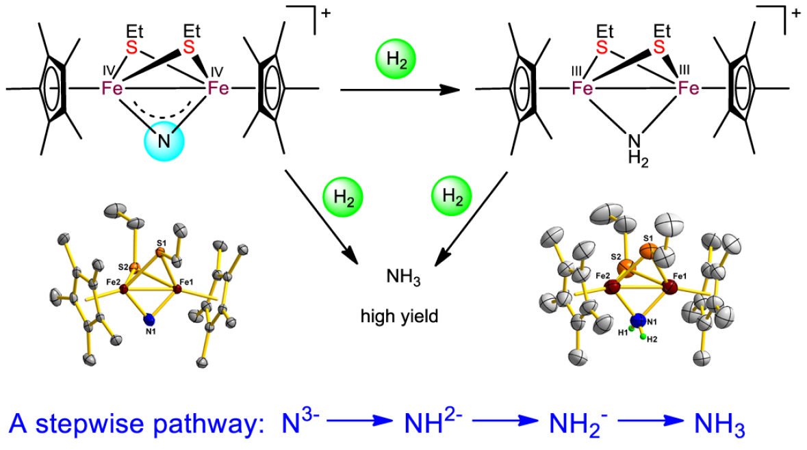 无论是在工业合成氨,还是在生物固氮酶固氮过程中,铁氮化物(Fe≡N)均被认为氮气还原转化为氨气的关键中间体。近年来,基于理论计算研究推测,活泼的氮化物中间体的生成与氢化还原放氨,可能是通过多个铁中心的协同作用而得以实现的,但是迄今为止仍然缺乏可靠的实验证据。因此,构筑双核铁氮化物模型配合物并实现逐步还原放氨,特别是直接利用氢气活化放氨功能具有十分重要的科学意义和挑战性。