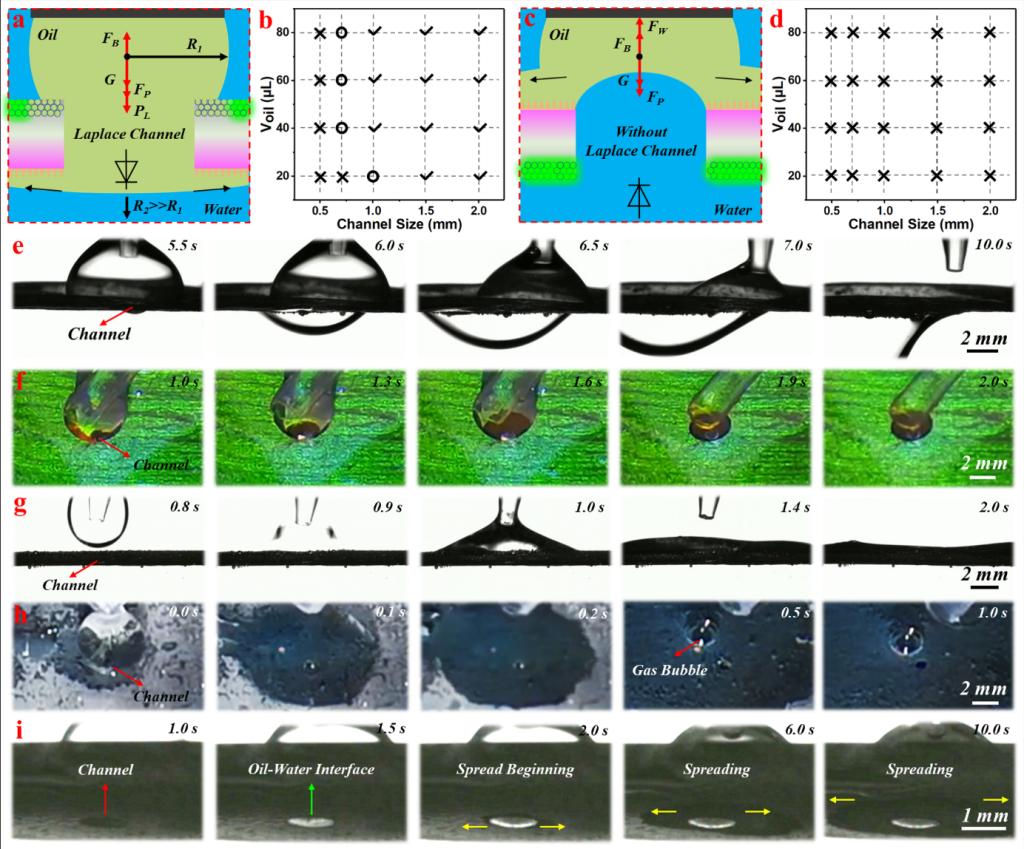 图2. 油滴在薄膜表面的受力分析示意图, (a) 亲水层朝上, (c) 超疏水层朝上; 油滴体积和孔洞直径对渗透的影响, (b) 亲水层朝上, (d) 超疏水层朝上; 典型的 (e, f) 渗透和 (g, h) 扩散过程;(i) 油水界面穿透通道后在疏水的铜微纳阵列表面上的铺展过程。
