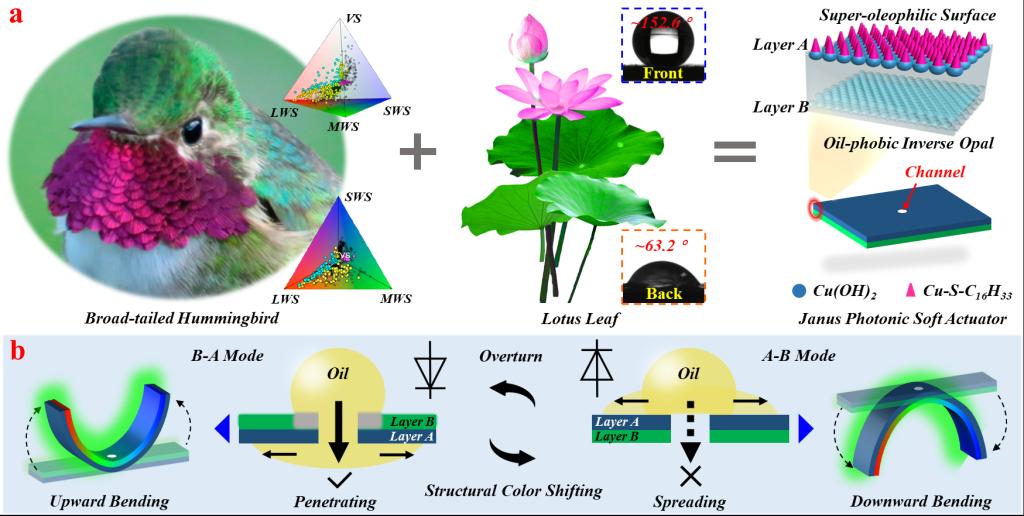 图 1. a)宽尾蜂鸟羽毛的结构色、荷叶正反面的浸润性及Janus膜的结构示意图; b) 由水下油滴单向渗透触发的Janus膜的定向弯曲示意图。