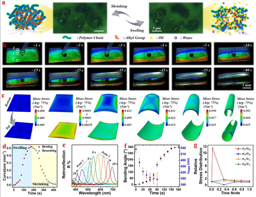 如图3a所示,通过光学显微镜观察了超疏水层表面铜微纳阵列的溶胀过程,溶胀后,铜阵列间距明显增大。Janus膜正反面的不对称溶胀最终促使软致动器弯曲。弯曲前,亲水层表面的反蛋白石可在光源方向产生角度依赖的逆反射光(图3b),初始入射角和观察角分别为~60°和~50°时,亲水层显示绿色。弯曲过程中,由于不同弧度处的入射角和观察角实时变化,对应反蛋白石的逆反射发生变化,整个曲面显示不同的结构色。通过有限元模拟分析了超疏水层的顶部和底部的内应力分布变化。顶部内应力分布密度从边缘向整个平面转移,而底部内应力分布密度从Janus膜的长边向四面转移,与观察到的结构色的变化过程相似。利用结构色可以揭示Janus膜弯曲过程中的相关动力学过程,并可视化分析内应力的变化和转移。