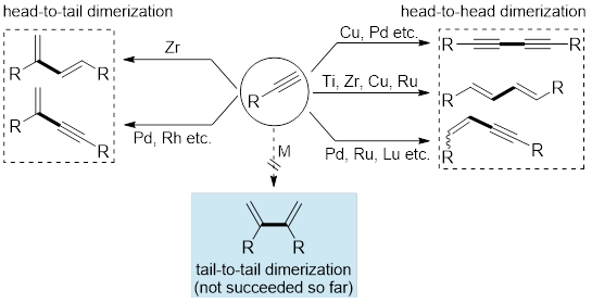 在过渡金属催化或介导下,已通过端炔的首-首二聚和首-尾二聚反应,成功合成了共轭二炔、二烯和烯炔化合物。然而,通过端炔的尾-尾二聚反应合成2,3-二取代-1,3-丁二烯化合物的例子,迄今为止未见报道。相较于已报到的合成方法,通过端炔的尾-尾二聚反应合成2,3-二取代-1,3-丁二烯化合物,具有步骤经济的优点。