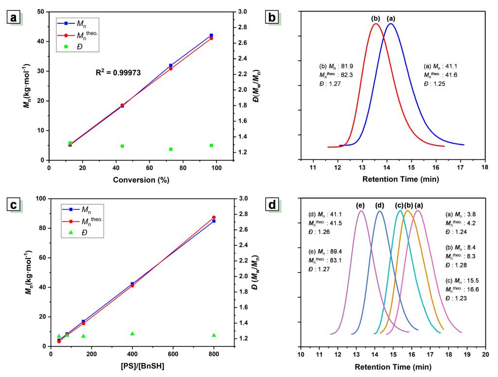 在本研究中,发现在MTBD/[PPN]SbF6/BnSH的催化下,S8和MT的共聚反应以阴离子聚合(可能为“活性聚合”)方式进行。跟踪反应表明,随着MT转化率的增加,凝胶渗透色谱法(GPC)测定的分子量Mn呈线性增加,与理论分子量(Mntheo.)吻合较好,Đ保持较低状态(图3a)。此外,还进行了二次加料实验,以表明这种共聚的可控特性(图3b)。最后,随着[MT]/[BnSH]摩尔比的增加,Mn呈线性增加,并与Mntheo.吻合较好,Đ保持较低状态 (图3c和d)。这些结果支持了本实验表现出活性聚合的特征。