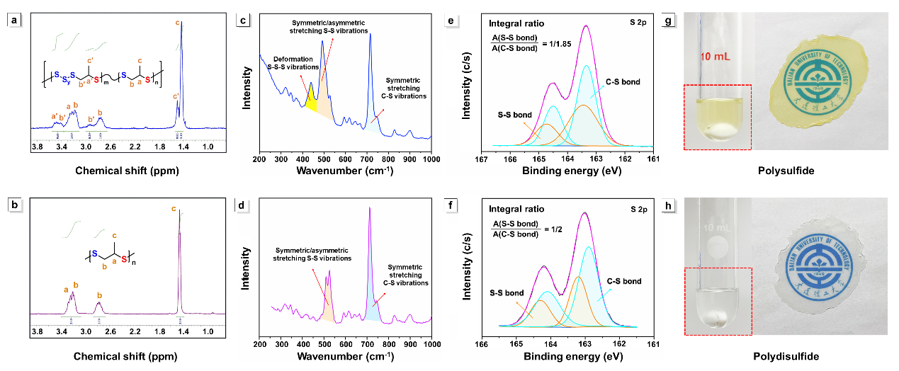 图2 (a)、(c)、(e)分别为MTBD和BnSH共聚物的1H NMR、Raman光谱和X射线光电子能谱。(b)、(d)、(f)分别为MTBD和BnSH在[PPN]X存在下的1H NMR、Raman光谱和X射线光电子谱。(g)和(h)分别为聚多硫化合物和聚二硫化合物反应液与薄膜的照片。