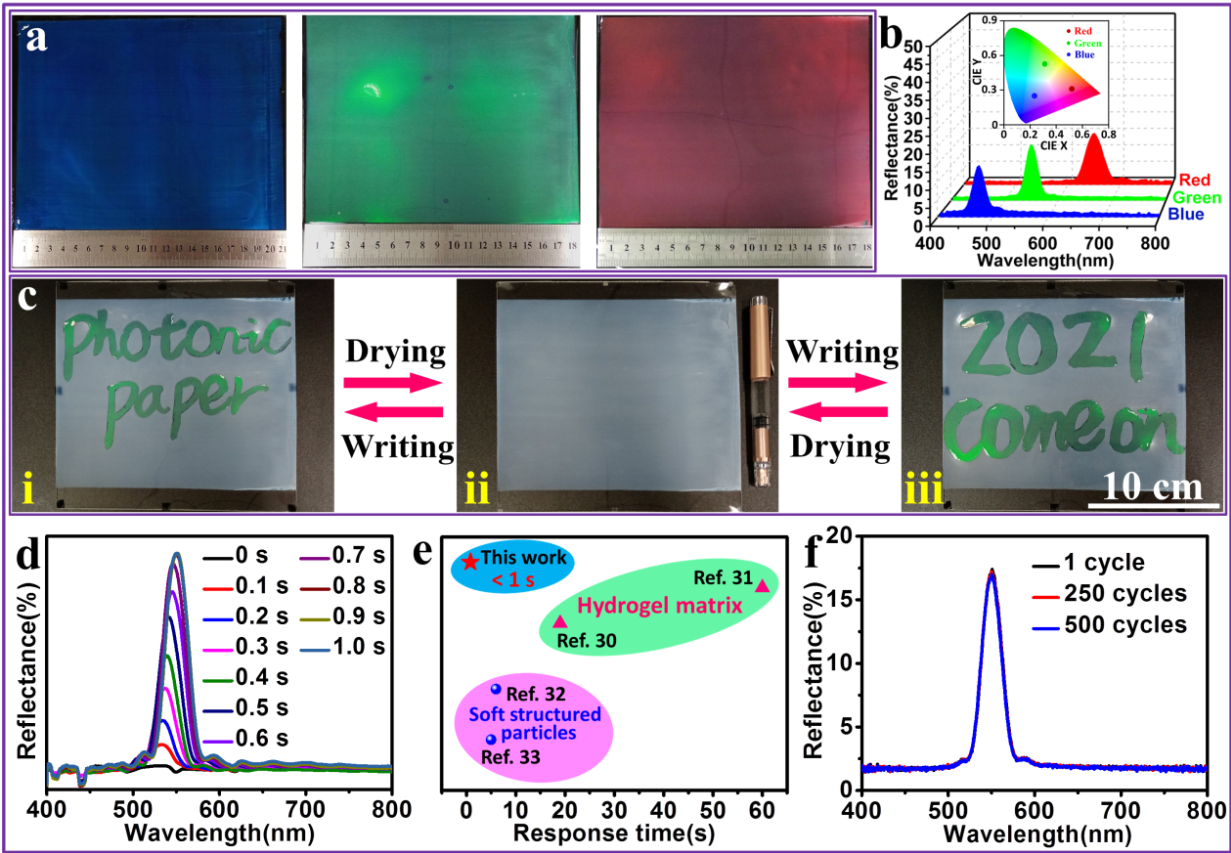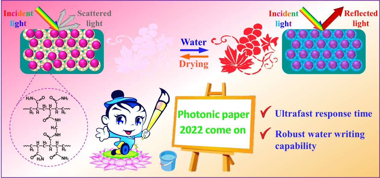 与传统纸张相比,水可重写的光子纸因其无污染、环保的特点引起了研究者们广泛地关注。然而有报导的基于水凝胶基质溶胀行为,通过调整周期性晶格常数或以软结构乳胶微球作为构建单元通过改变折射率比制备的光子纸水写显色速度较慢,同时凝胶材料对水环境的依赖性在一定程度上限制其潜在的实际应用,因此开发环境适应性好、快速水写显色的光子纸成为当今研究的主流方向。