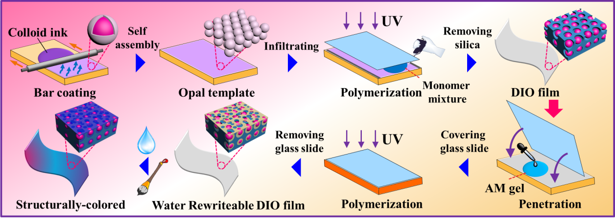 研究人员通过在双反蛋白石光子晶体 (DIOPC) 膜的反蛋白石聚合物骨架孔内填充丙烯酰胺的乙醇分散液,然后光聚合形成亲水的聚丙烯酰胺 (PAM) 凝胶网络,制备了具有超快响应时间 (~0.8 s) 和强健水可重写 (>500次“写-擦-写”) 性能的凝胶杂化的水可重写DIOPC膜 (图1)。反蛋白石聚合物骨架孔内形成的亲水PAM凝胶网络可以诱导水快速渗透进反蛋白石聚合物骨架的孔内,使得孔内的聚苯乙烯微球在水环境中从随机分布到受液体浮力作用而均匀分布,从而消除散射干扰,产生亮丽的结构色 (图2)。