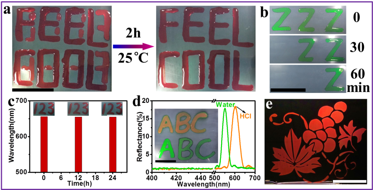 图4. 结构色图案的时空响应性和水写结构色保留时间的可控性