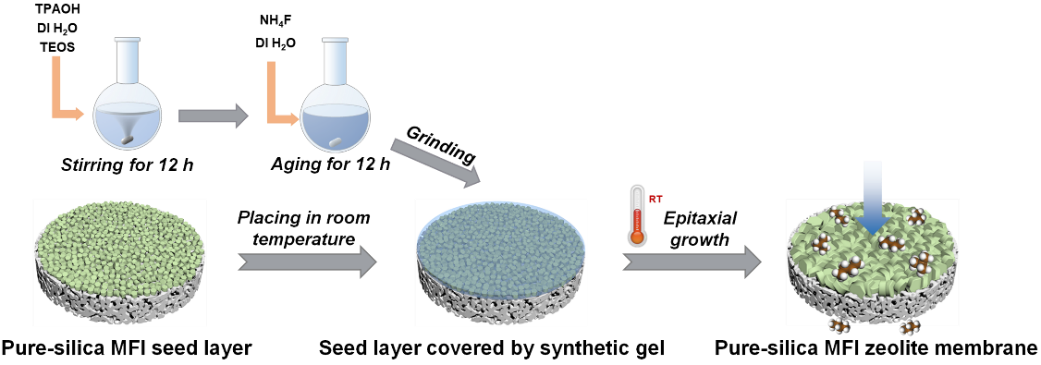 图1. 室温外延生长制备高性能纯硅MFI沸石膜示意图