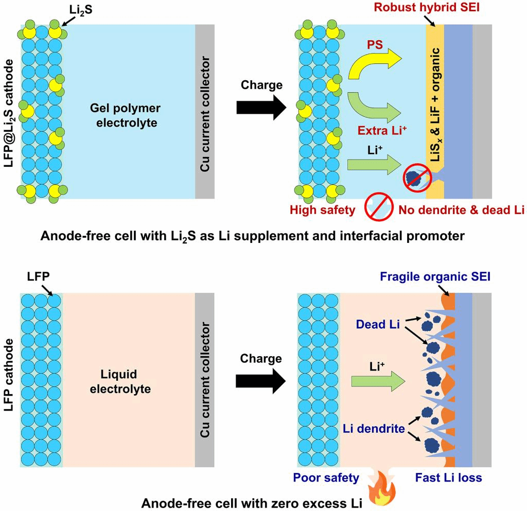 图1. 利用硫化锂作为双功能补锂剂与界面改性剂,通过锂补偿耦合界面SEI膜性质调控抑制无负极电池不可逆锂损失的技术策略