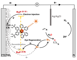 利用光电化学池分解水是实现人工光合作用的重要途径,然而光阳极上进行的水氧化反应面临诸多挑战,如高热力学能量需求和动力学缓慢等。尽管目前已经开发了诸多策略,但光阳极的效率仍未达到实际应用的需求。作为太阳能清洁转换的新途径,光阳极上的水氧化反应理论上可以用能量需求较低的有机底物氧化反应替代,实现高附加值化学品的制备与光阴极制氢相结合。近期,大连理工大学精细化工国家重点实验室李斐教授构建了一种钌基染料敏化光阳极,以LiBr为电子传输中介,以水为氧源,实现了对烯烃的高效高选择性光电催化环氧化。