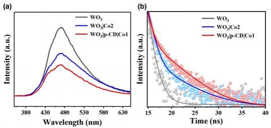3 杂化光阳极的荧光光谱。(aWO3WO3|Co2WO3|p-CD|Co1光阳极的稳态荧光发射光谱。(bWO3WO3|Co2WO3|p-CD|Co1光阳极的时间分辨荧光光谱。激发波长为375 nm,监测460 nm处的荧光衰减。