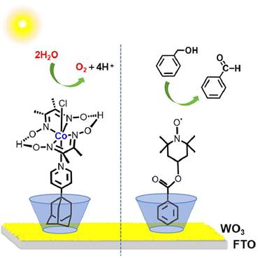 在太阳能分解水器件中,分子催化剂与可见光吸收半导体相耦合的复合体系兼具前者的高催化活性与后者的光稳定性优势,因此具有广阔的应用前景。然而,通过何种方式合理的构建杂合体系仍然是人工光合作用所面临的挑战之一。基于以上背景,大连理工大学精细化工国家重点实验室李斐教授创新性地将主-客体自组装策略用于构建高性能复合光阳极。该策略利用多个膦酸基团修饰的环糊精(p-CDs)作为主体分子,通过化学吸附稳定的负载于WO3半导体光阳极薄膜的表面。同时,修饰有疏水基团的分子催化剂作为客体分子,能够自发的进入p-CDs的空腔,形成WO3|p-CD|catalyst杂合电极,用于光电催化水氧化以及有机底物的氧化(图1)。