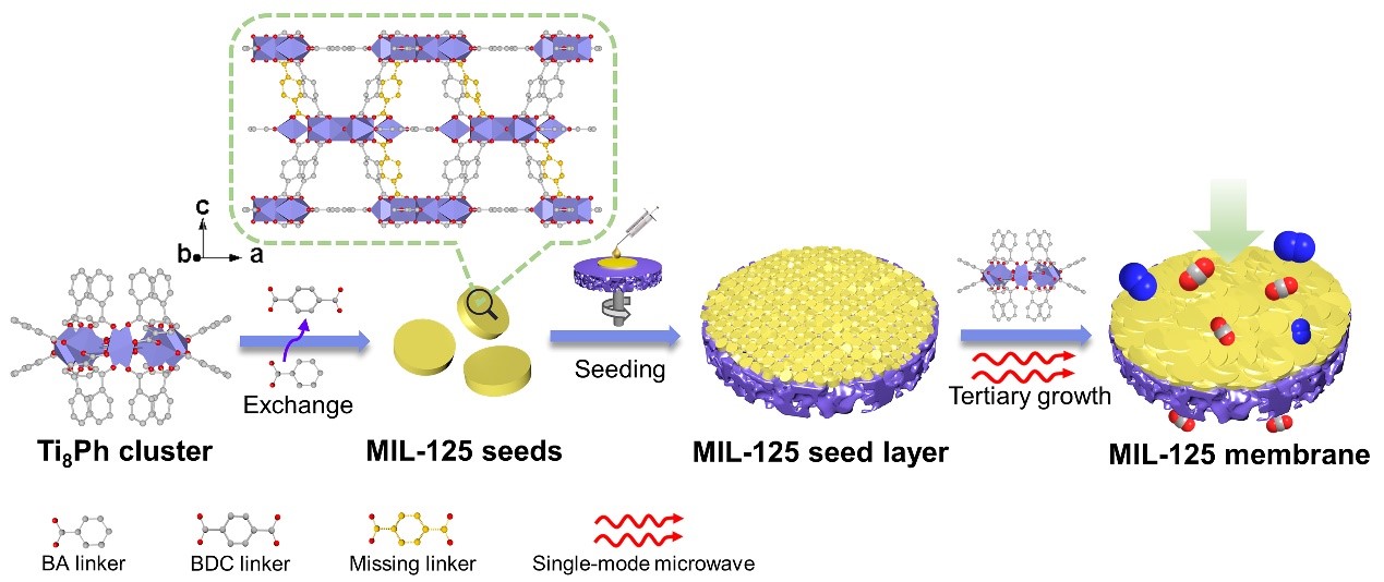 图1. 以Ti8Ph簇为钛源,结合单模微波辅助加热和三次生长制备富配位缺陷MIL-125膜示意图