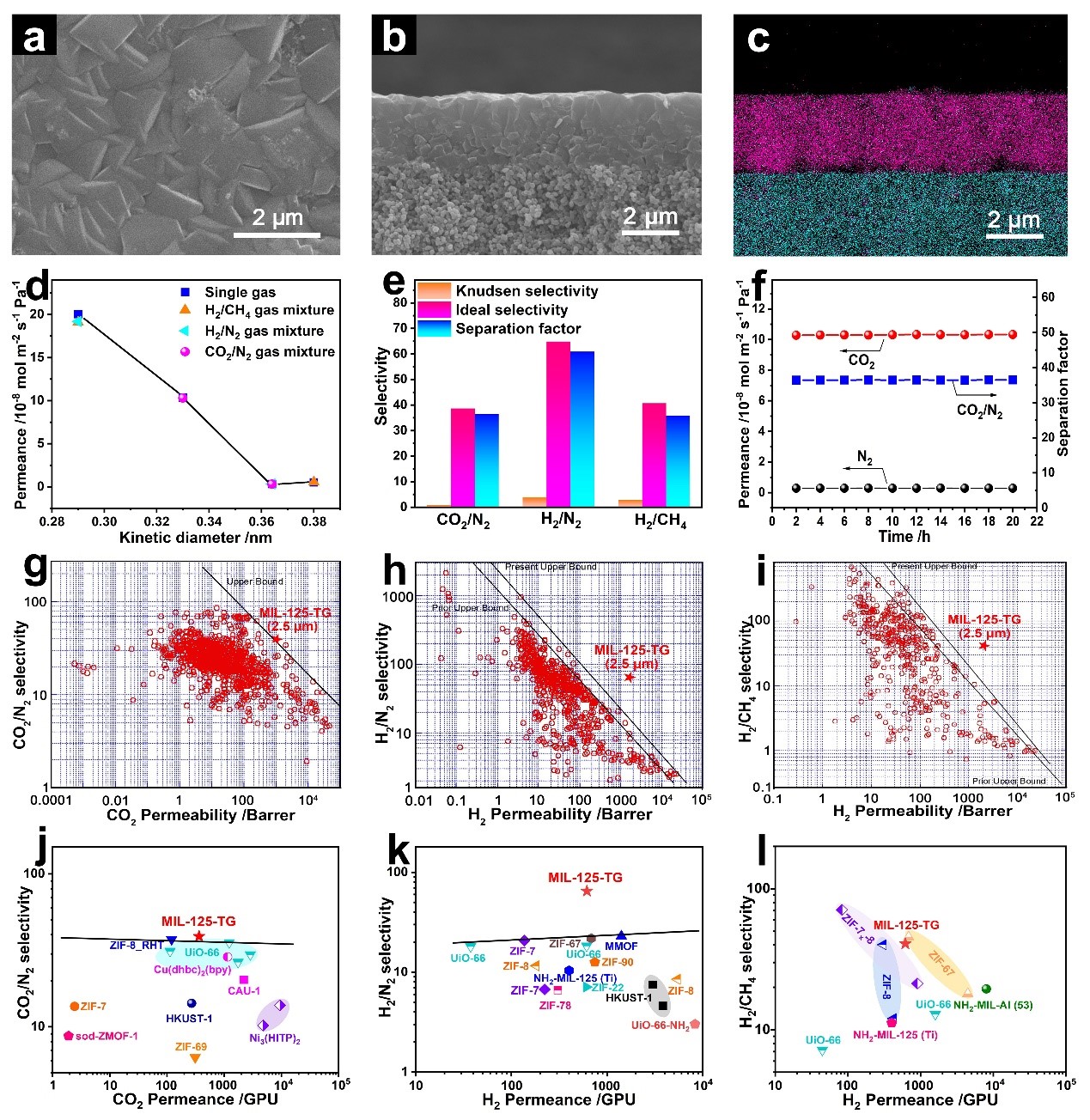 图2. (a-c) MIL-125-TG形貌表征;(d-e) MIL-125-TG气体分离性能;(g-i) MIL-125-TG气体分离性能与2008的Robeson上限;(j) MIL-125-TG与原始MOF膜在相同条件下CO2/N2分离性能比较。(k-l) MIL-125-TG与原始3D MOF膜在相同条件下H2/N2和H2/CH4分离性能比较。