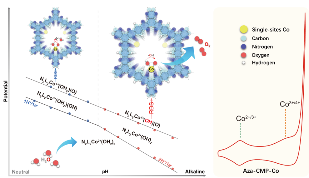 为了回答这一问题,作者在该工作中通过Co离子与氮杂共轭微孔聚合物 (Aza-CMP) 配位制备了具有明确活性位点的模型水氧化催化剂。电势-pH图(Pourbaix)、动力学同位素效应(KIE)、质子盘点(proton inventory)、原子质子转移(atom proton transfer)和阳离子效应(cation effects)等实验结果表明,在中性和碱性条件下催化剂中单位点钴的O-O键形成途径完全不同。当电解质的pH值大于Co3+中间体的pKa值时,酸碱反应引起的额外去质子过程导致了触发O-O键形成的Co4+=O中间体拥有额外OH配体,引起了分子内羟基亲核攻击 (IHNA)的发生。与传统的分子间水亲核进攻途径相比,IHNA路径中扩散控制的界面质子转移和耗能的水O-H键裂解过程不再参与O-O键形成,使得催化过程有更小的活化能和更快的水氧化反应动力学。