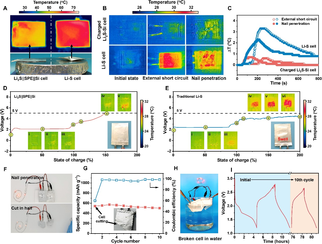 图2. 基于硫化锂正极与硅负极的全固态软包电池安全性评价:(A)过热、(B,C)内、外部短路、(D,E)过充、(F,G)空气中穿刺剪切后充放电、(H,I)剪切浸水后充放电。