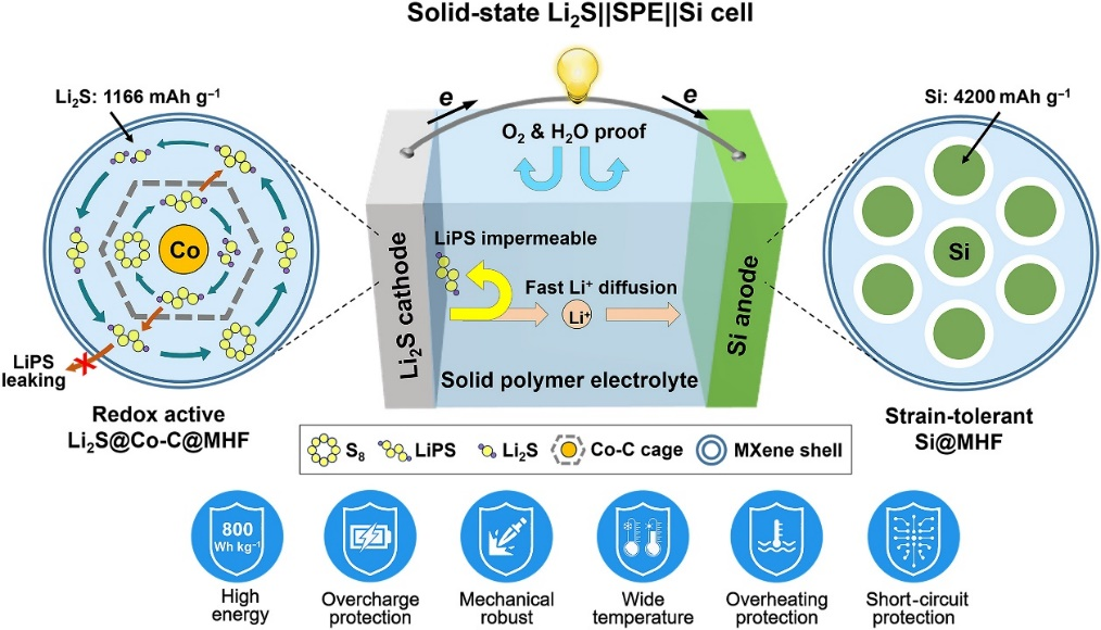 针对现有电池技术安全性与能量密度“鱼与熊掌不能兼得”的瓶颈,精细化工国家重点实验室、化工学院王治宇、邱介山教授在Science子刊Science Advances发表题为“A Li2S-based all-solid-state battery with high energy and superior safety”的研究论文。融合硫化锂正极与硅负极之间本质安全的多电子氧化还原反应与高可靠性的固态电池设计,发展了一类比能量520 Wh kg-1以上、兼具高安全性的全固态锂二次电池新体系。基于这一电池化学的软包电池在过热、内/外短路、机械损伤、过充及水/氧侵蚀等极端条件下仍可正常充放电;500 小时无自放电,并可在-20至80 oC的宽温区内工作,具有良好的环境适应性。联用原位X射线衍射、原位紫外-可见光谱、原位阻抗等先进谱学手段揭示了聚合物固态电解质中的多硫化物介导氧化还原反应机制与多硫化物穿梭抑制效应,发展了利用多级纳米反应器增强固态电解质中硫化锂正极反应活性、提升硅负极结构稳定性的高效策略。此项工作为跨越现有电池技术安全性与能量密度之间的巨大鸿沟,发展高能量、高安全性、高环境适应性的“三高”电池技术开辟了新的方向,在载人交通工具、空间技术、植入医疗、军事国防等对储能技术安全性、可靠性需求突出的领域尤具应用前景。