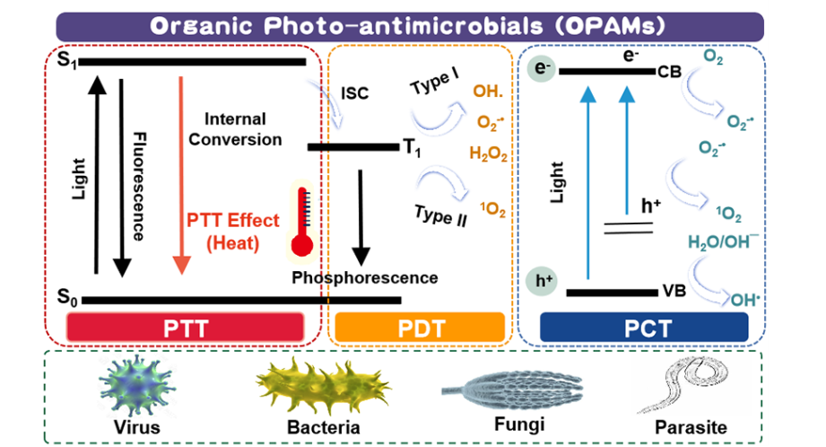 图1. 抗菌光疗产生ROS或热的光化学反应示意图