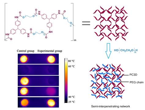 最近,精细化工国家重点实验室张淑芬教授团队的唐炳涛教授与吕荣文教授合作,在该领域取得重要进展,即在前期相关工作的基础上 ( Adv Func Mater, 2013,23, 4354-4360; Appl Energ, 2016, 184, 241-246; J Mater Chem A, 2017, 5, 958-968 ),两位老师共同指导的博士生张宇昂同学利用三苯基甲烷三异氰酸酯 (TTI) 与聚乙二醇 (PEG) 交联聚合,形成具有相变性能的三维交联网络 (PC3D),进一步负载链状聚乙二醇(PEG),形成半互穿网络结构,同时赋予材料定形与高相变潜热特性。通过调节链状PEG的分子量,可以调节材料的相变温度。实验结果表明,PC3D与链状PEG形成了半互穿网络结构并形成了统一的结晶区,由于PC3D本身具有相变性能,该复合材料在形状稳定的同时还具有高的相变焓值 (>169.7 J/g),且相变温度在45.3~61.4°C范围内可调,并具有良好的定形效果、热稳定性和循环稳定性,具有广阔的应用前景。该研究为制备高相变焓值定形相变储热材料提供了新思路,相关成果发表于AIChE. J., 2018,64, 688-696。
