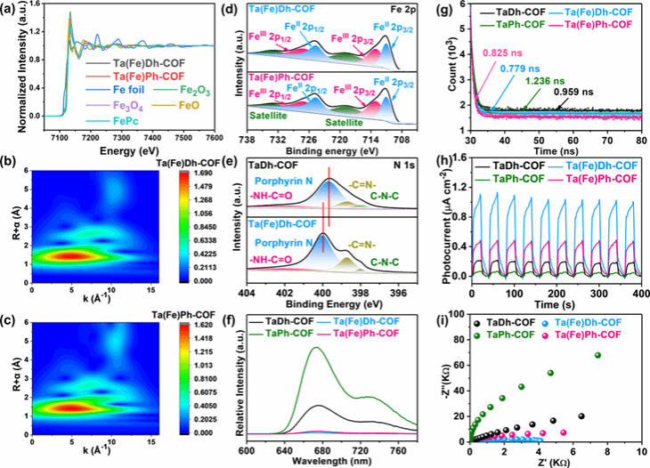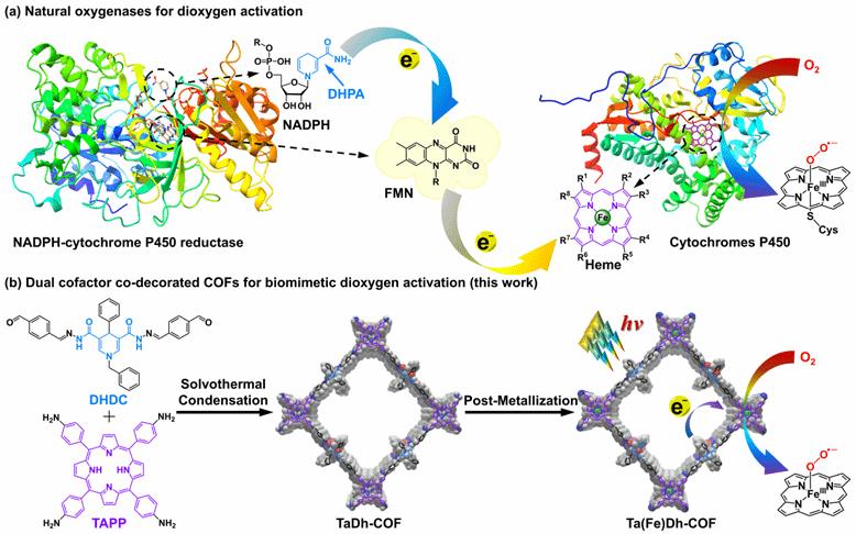 通过引入烟酰胺辅因子(NADH)的活性位点二氢吡啶酰胺(DHPA)功能单元和辅因子血红素功能单元,成功制备了一种含有双辅因子的共价有机框架Ta(Fe)Dh−COF。该COF复制了细胞色素P450酶的协同催化功能位点,实现了光驱动的O2选择性活化。双辅因子的引入促进了Ta(Fe)Dh−COF光生电荷的分离能力。这种高效的电荷分离确保了光生电子-空穴对的产生和转移过程,形成的光生电子直接从DHPA转移到血红素中的Fe3+上生成Fe2+,同时伴随DHPA•⁺光生空穴的产生。