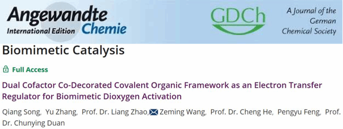 精细化工全国重点实验室“仿生识别与荧光传感”教育部创新团队在仿生催化领域取得了系列研究成果,构建了一系列超分子仿生催化体系,协同光/电等外场强化实现了多个仿生催化反应。近日,该团队基于前期工作基础(Angew. Chem. Int. Ed., 2025, e19123 (Cover Paper); J. Am. Chem. Soc., 2024, 146, 29272 (Cover Paper); J. Am. Chem. Soc., 2023, 145, 6719; J. Am. Chem. Soc., 2019, 141, 12707; Nat. Commun., 2024, 15, 8813; Nat. Commun., 2021, 12, 5092; Nat. Commun., 2020, 11, 2903; Angew. Chem. Int. Ed., 2022, 61, e202114490; Angew. Chem. Int. Ed., 2017, 56, 15284; Angew. Chem. Int. Ed., 2017, 56, 8692),采用生物分子活性中心作为构筑单元成功构筑了具有仿生催化功能的共价有机框架(Covalent Organic Frameworks, COFs),可作为O2活化的调节剂应用于选择性氧化反应,不仅为功能化COFs的构建提供了新方案,同时为多孔COFs的应用拓展了新领域。相关成果以“Dual Cofactor Co-Decorated Covalent Organic Framework as an Electron Transfer Regulator for Biomimetic Dioxygen Activation”为题发表在《德国应用化学》(Angewandte Chemie International Edition)上。论文第一作者为博士研究生宋强,通讯作者为赵亮副教授。
